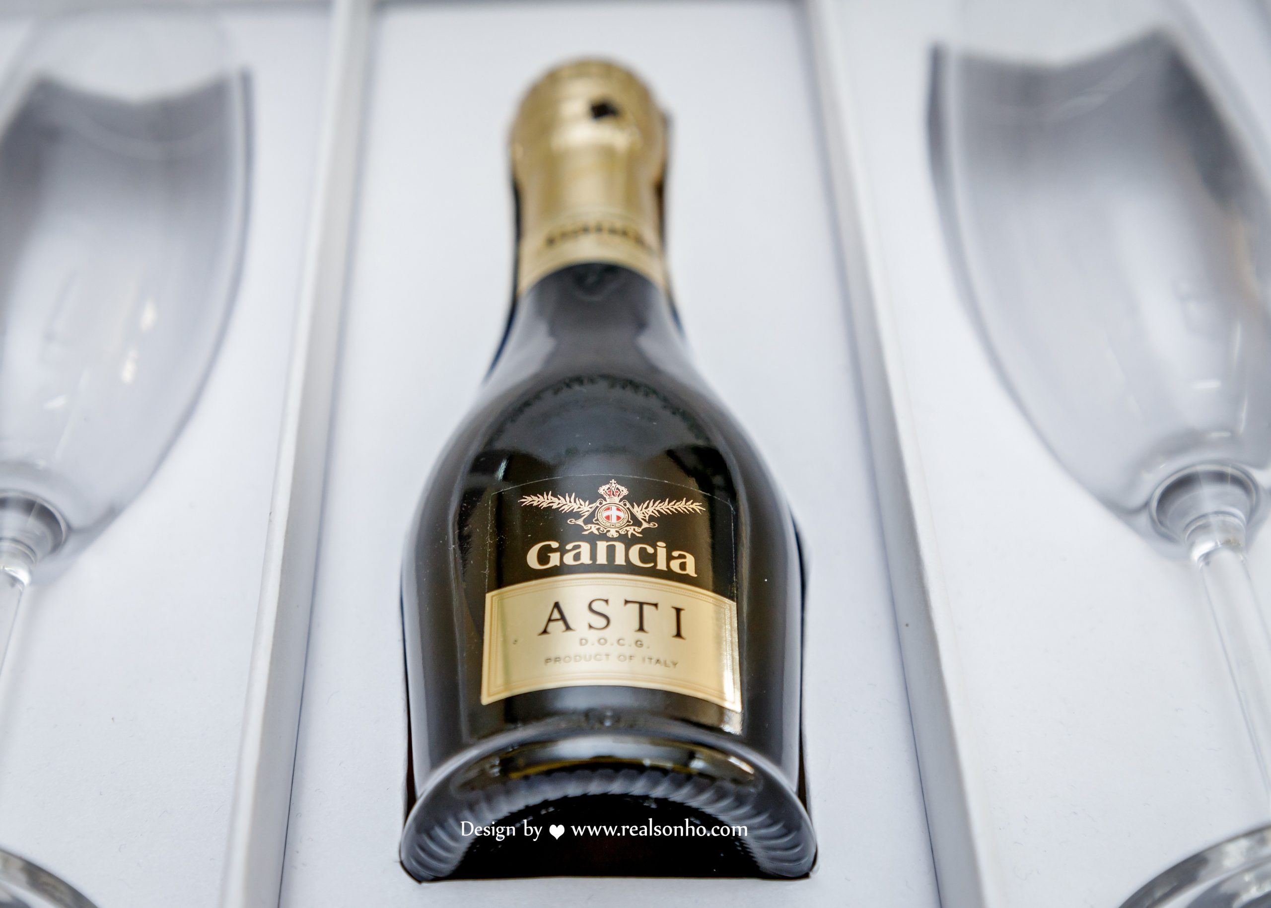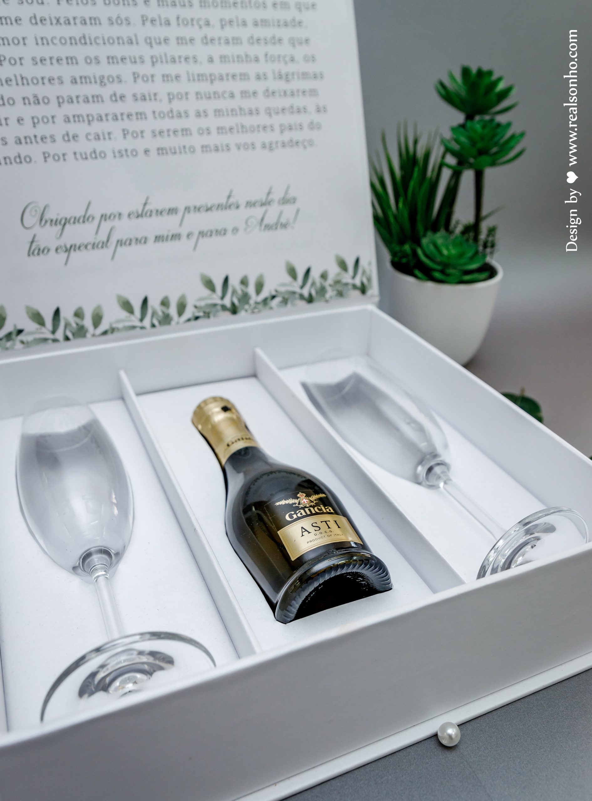 No seu interior leva uma lembrança personalizada, espumante Asti-Gância 20 cl e 2 flutes gravados a laser (com iniciais ou nome dos noivos e data do casamento)