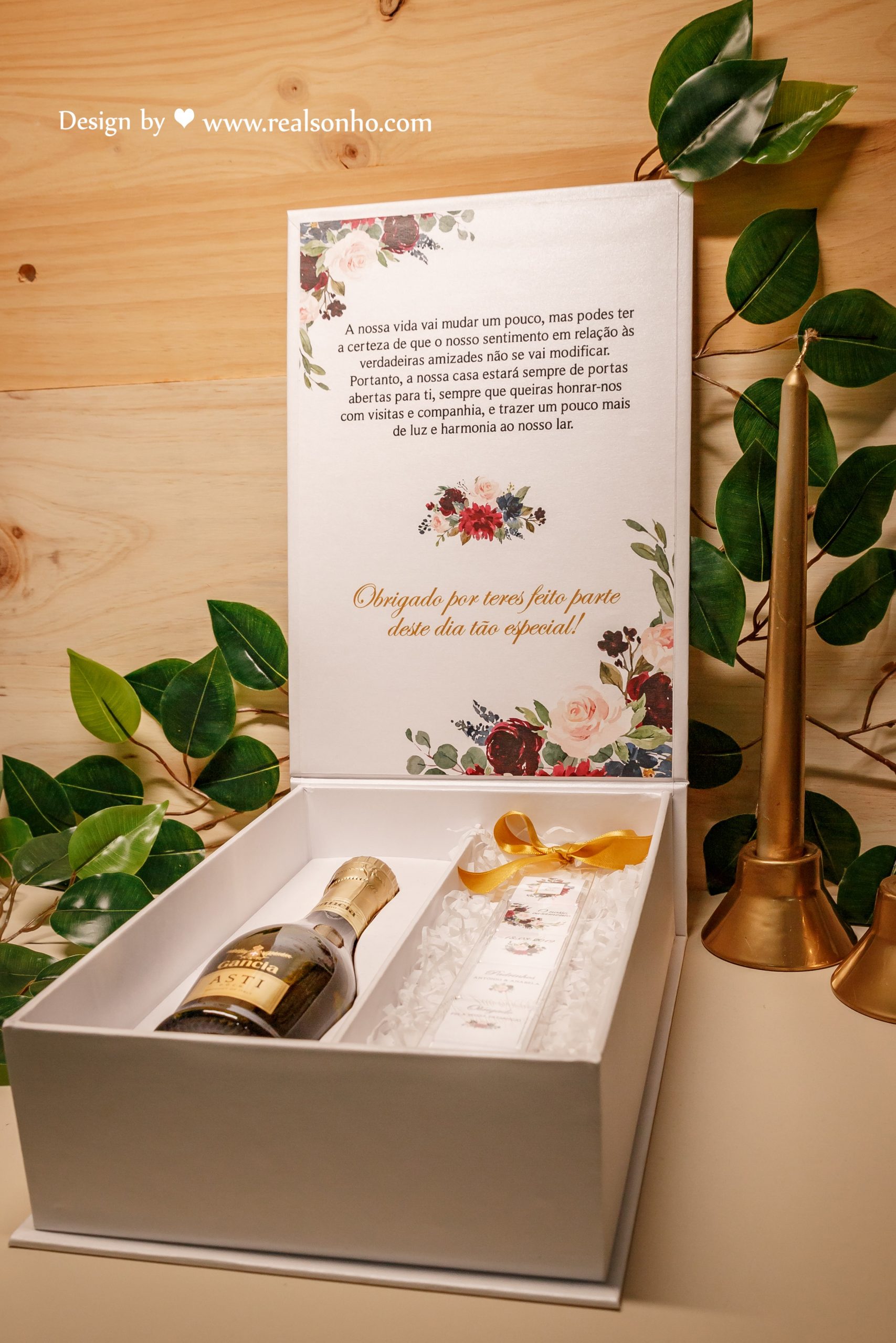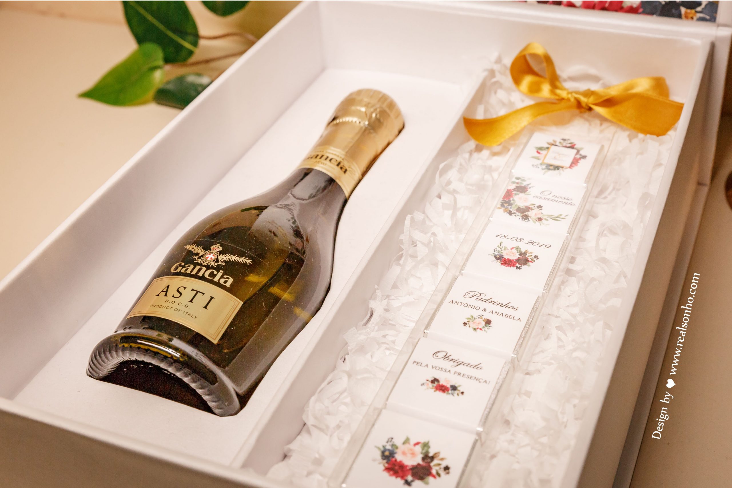 No seu interior leva uma lembrança personalizada, espumante asti-gância 20 cl e caixa acrílica com 6 napolitanas personalizadas