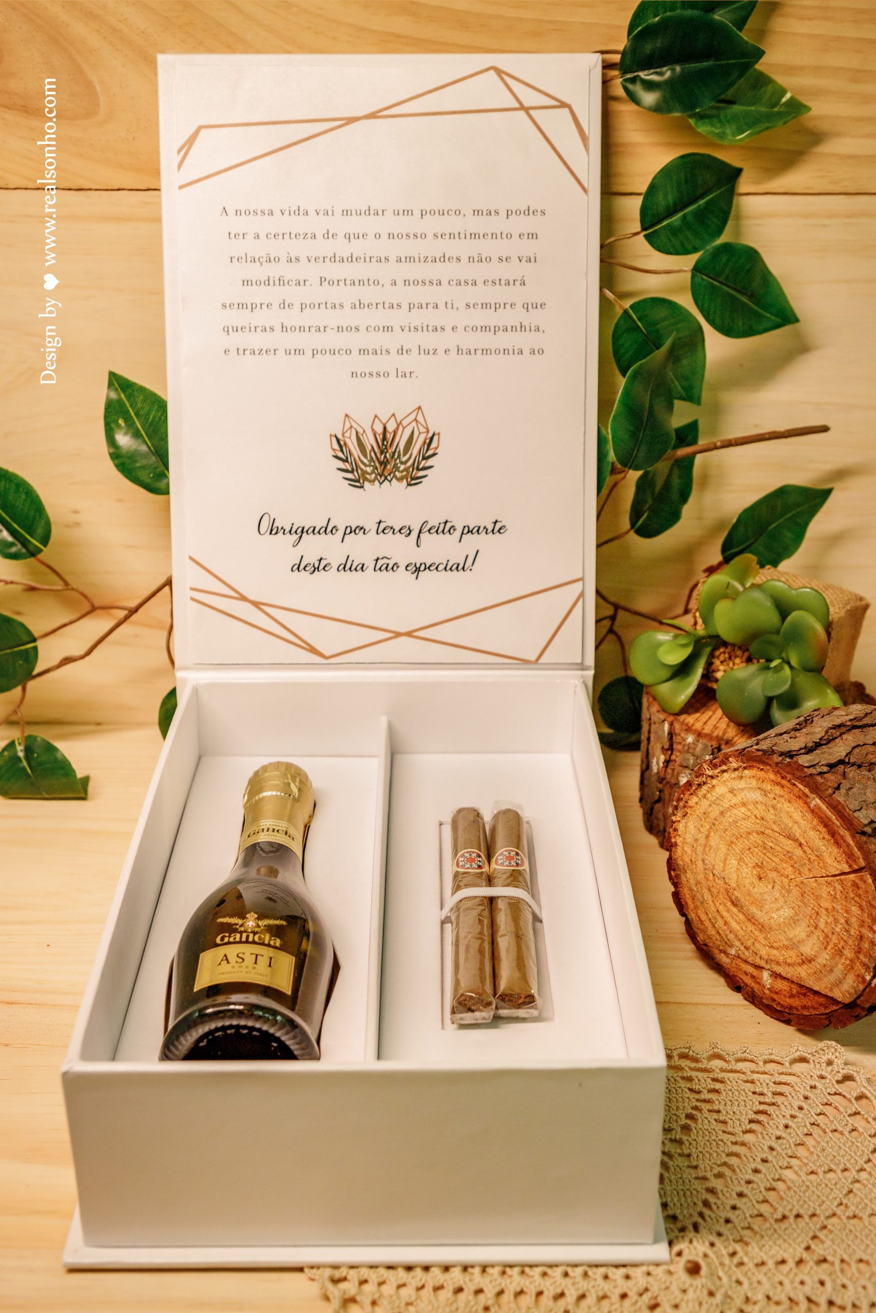 No seu interior leva uma lembrança personalizada, espumante Asti-Gância 20 cl e 2 charutos