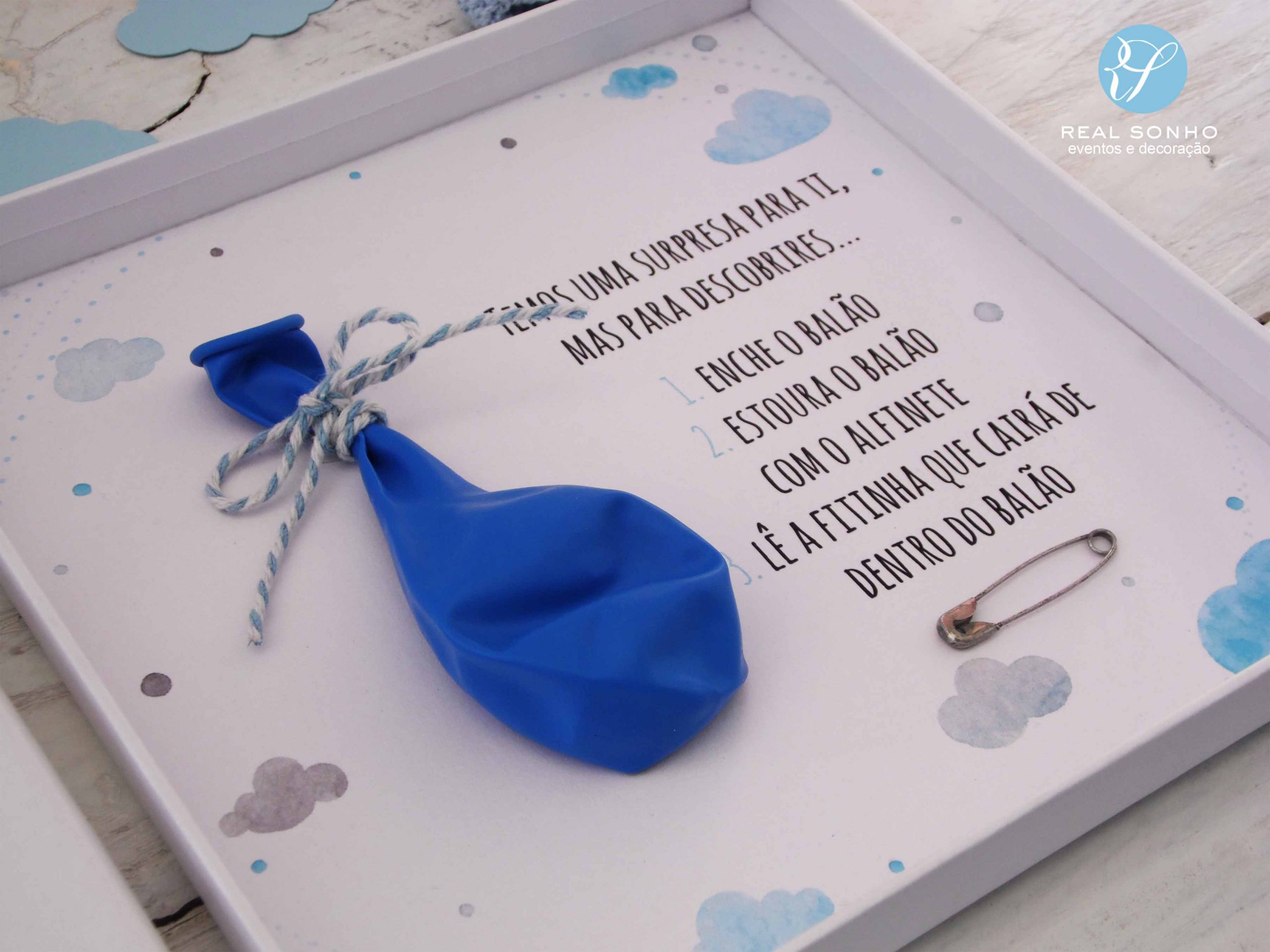 Interior: balão (com a mensagem dentro) e alfinete (para rebentar o balão)