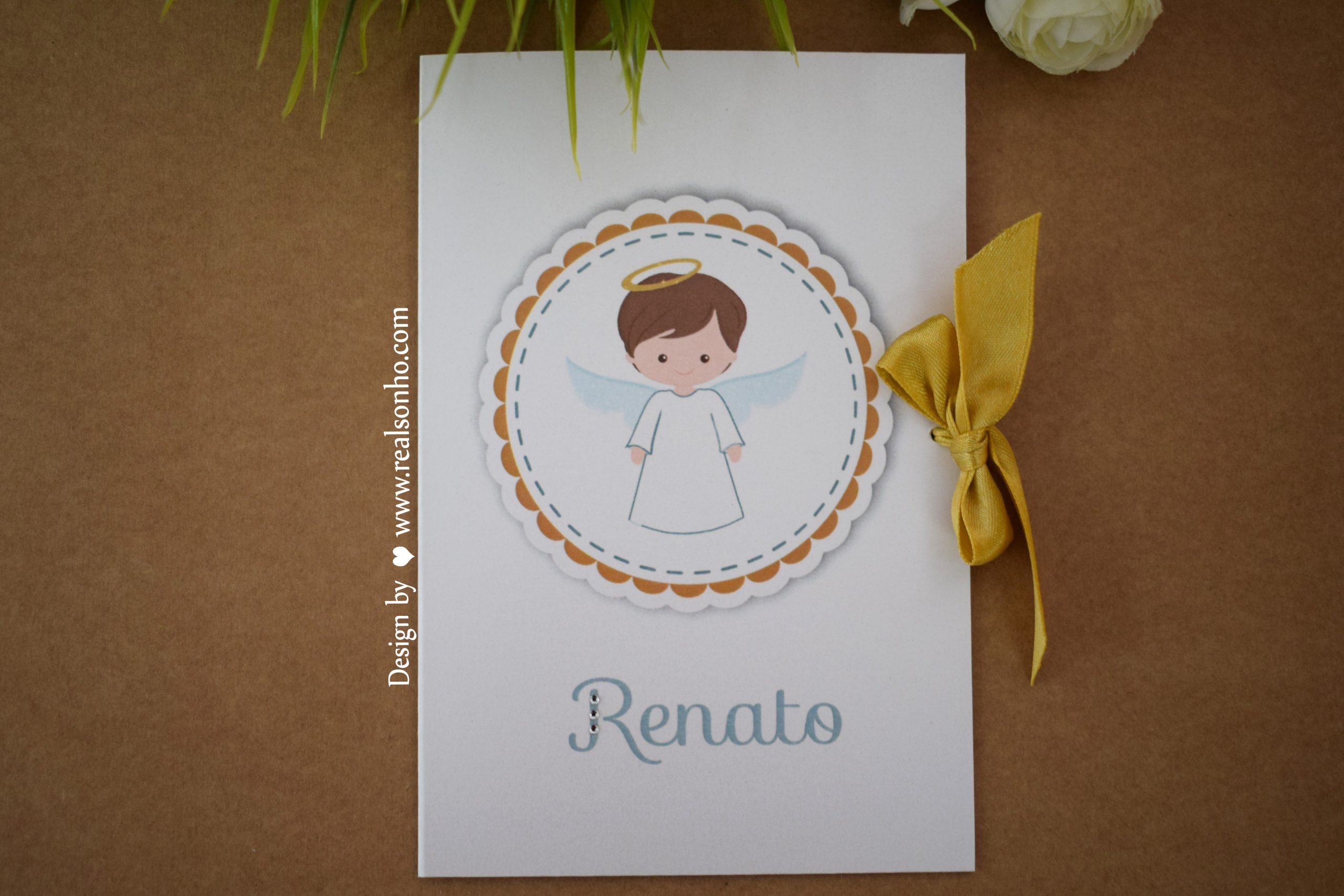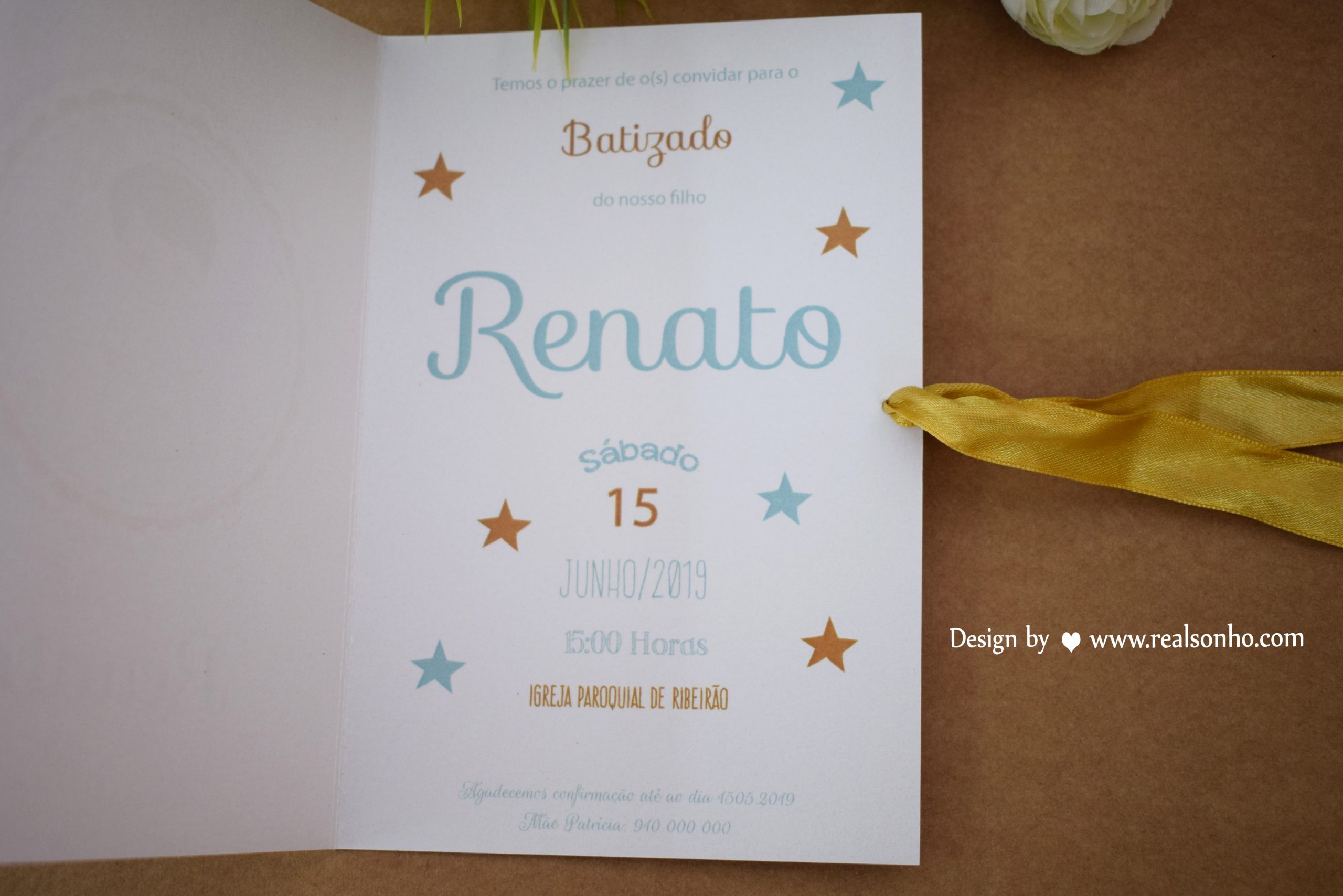 Decoração: impressão personalizada e fita de cetim dourada