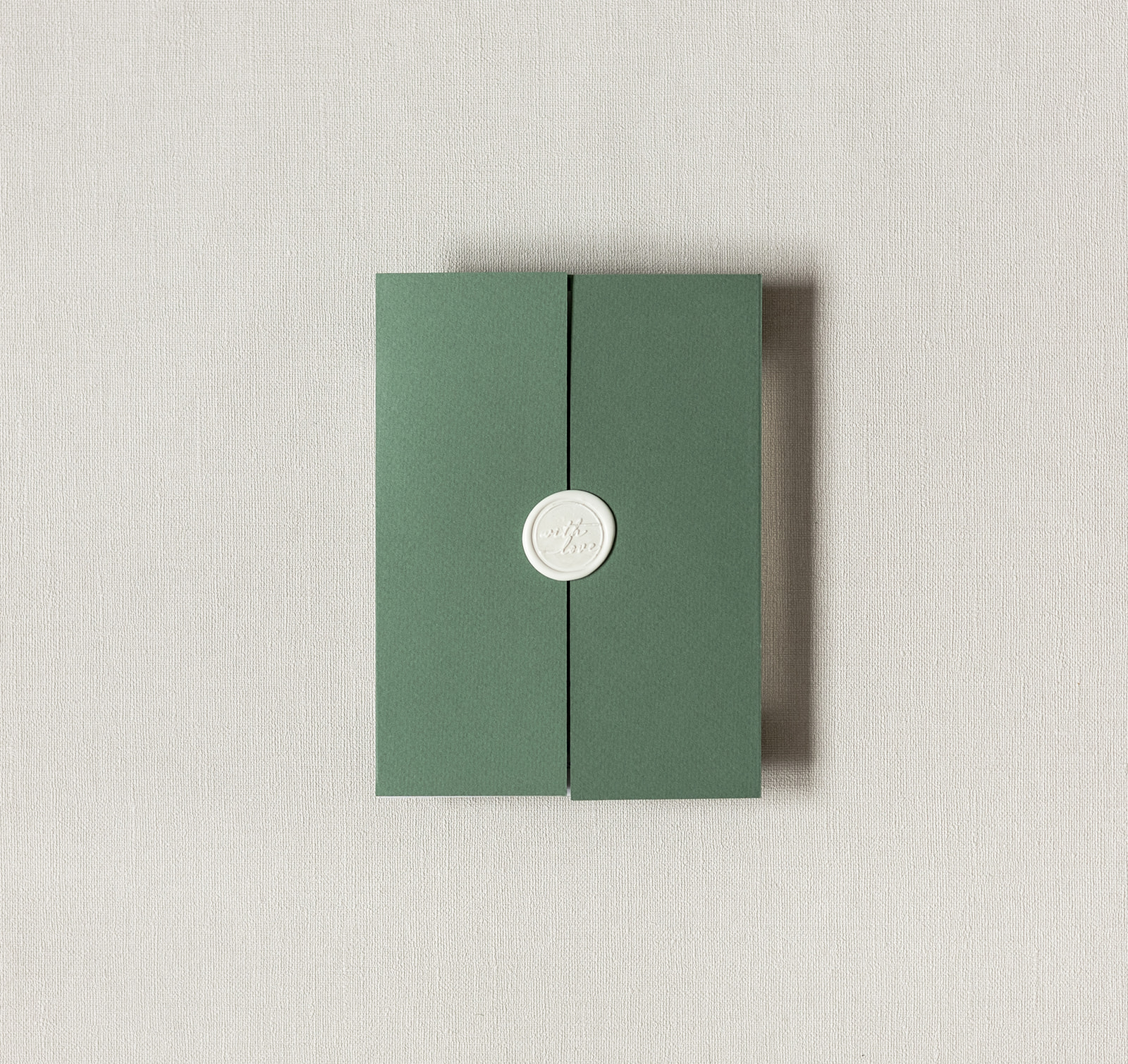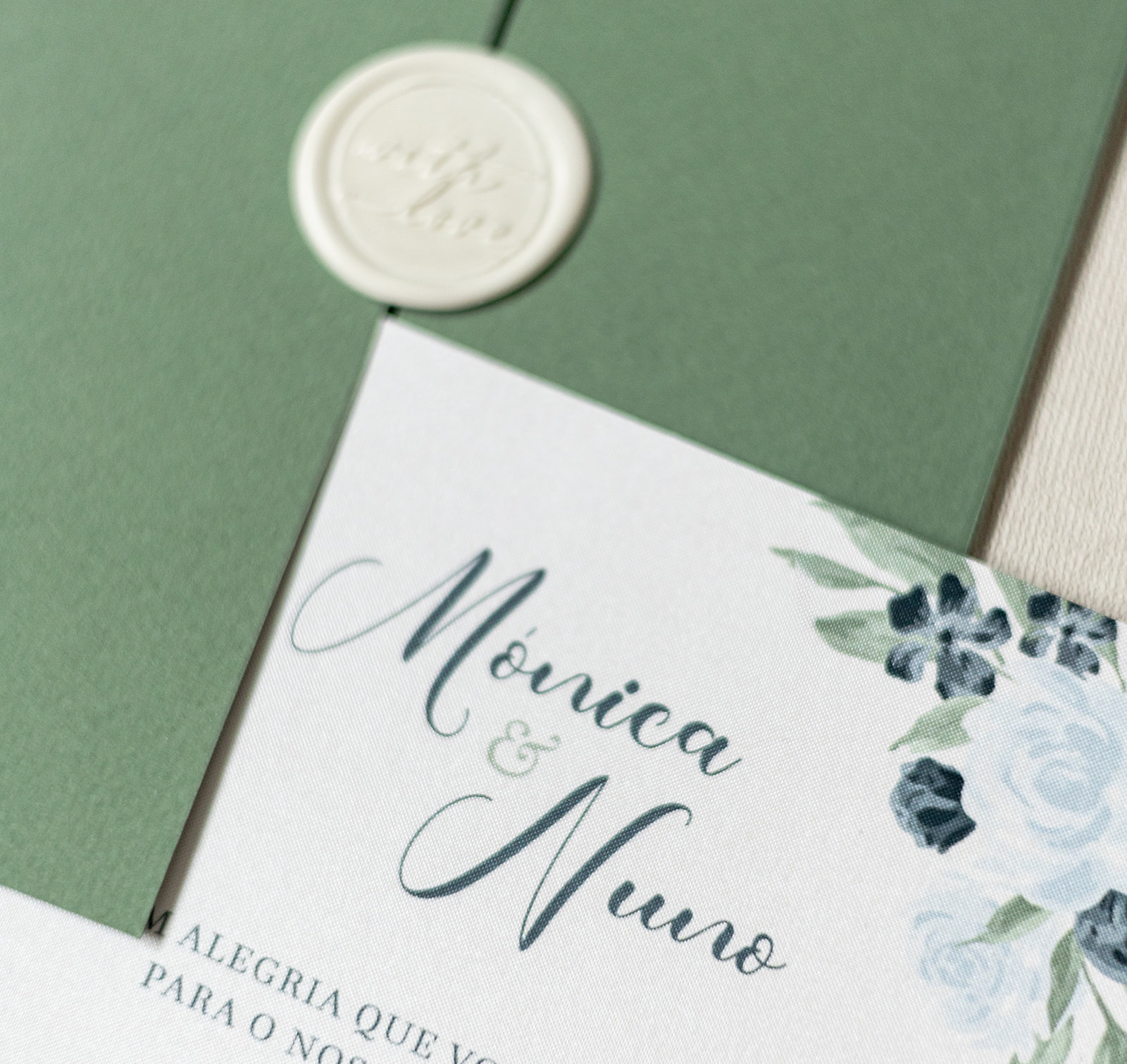 Convite de casamento verde pastel com lacre branco e design floral delicado. Um modelo elegante e minimalista para celebrações únicas.