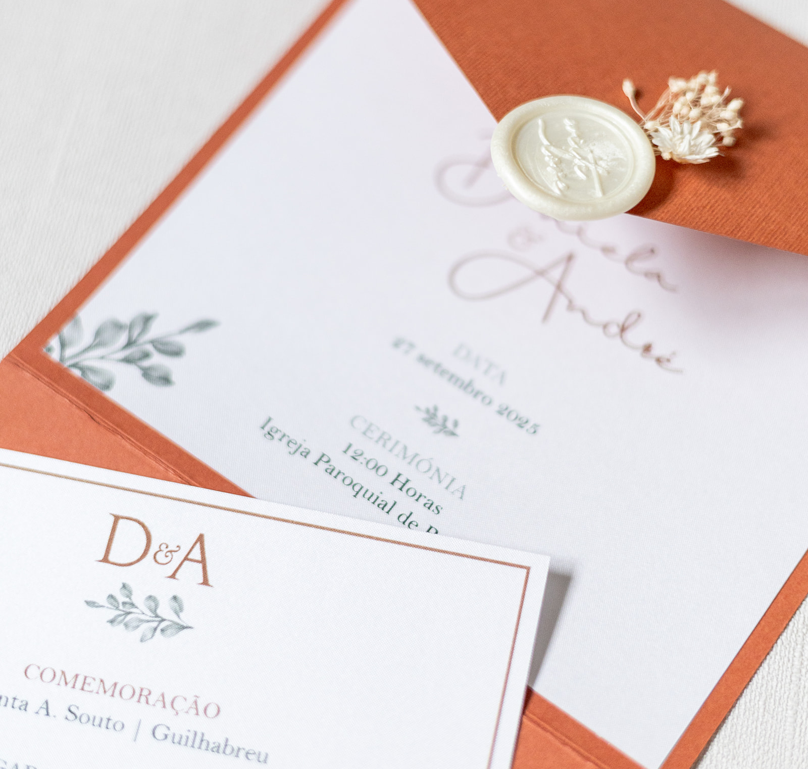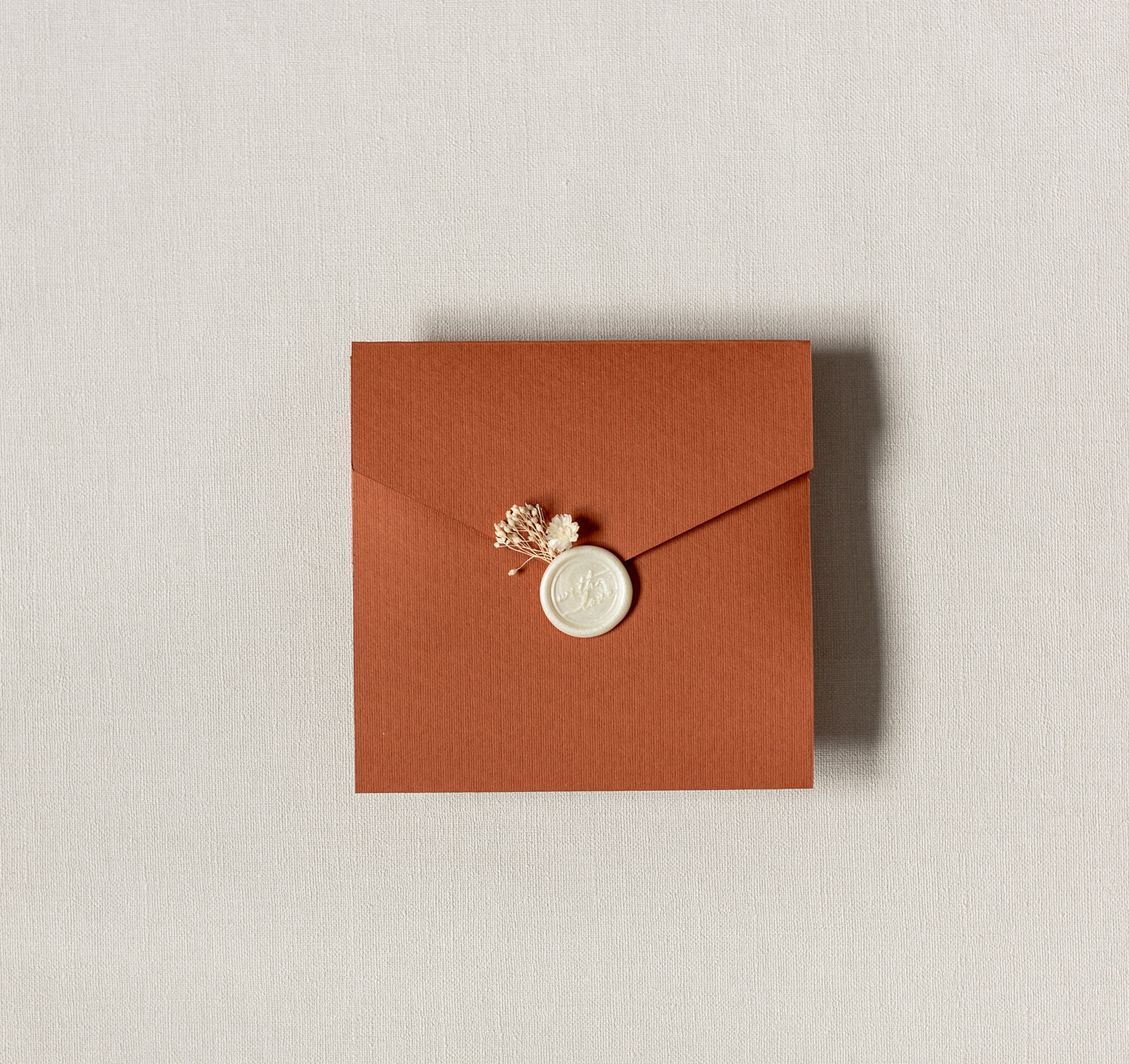 Convite de casamento moderno em terracota com lacre elegante. Design sofisticado que encantará os seus convidados desde o primeiro olhar.