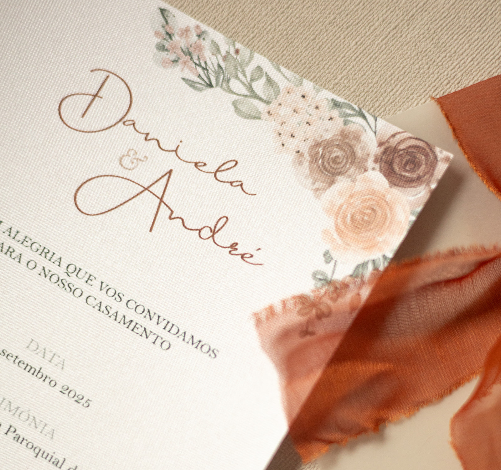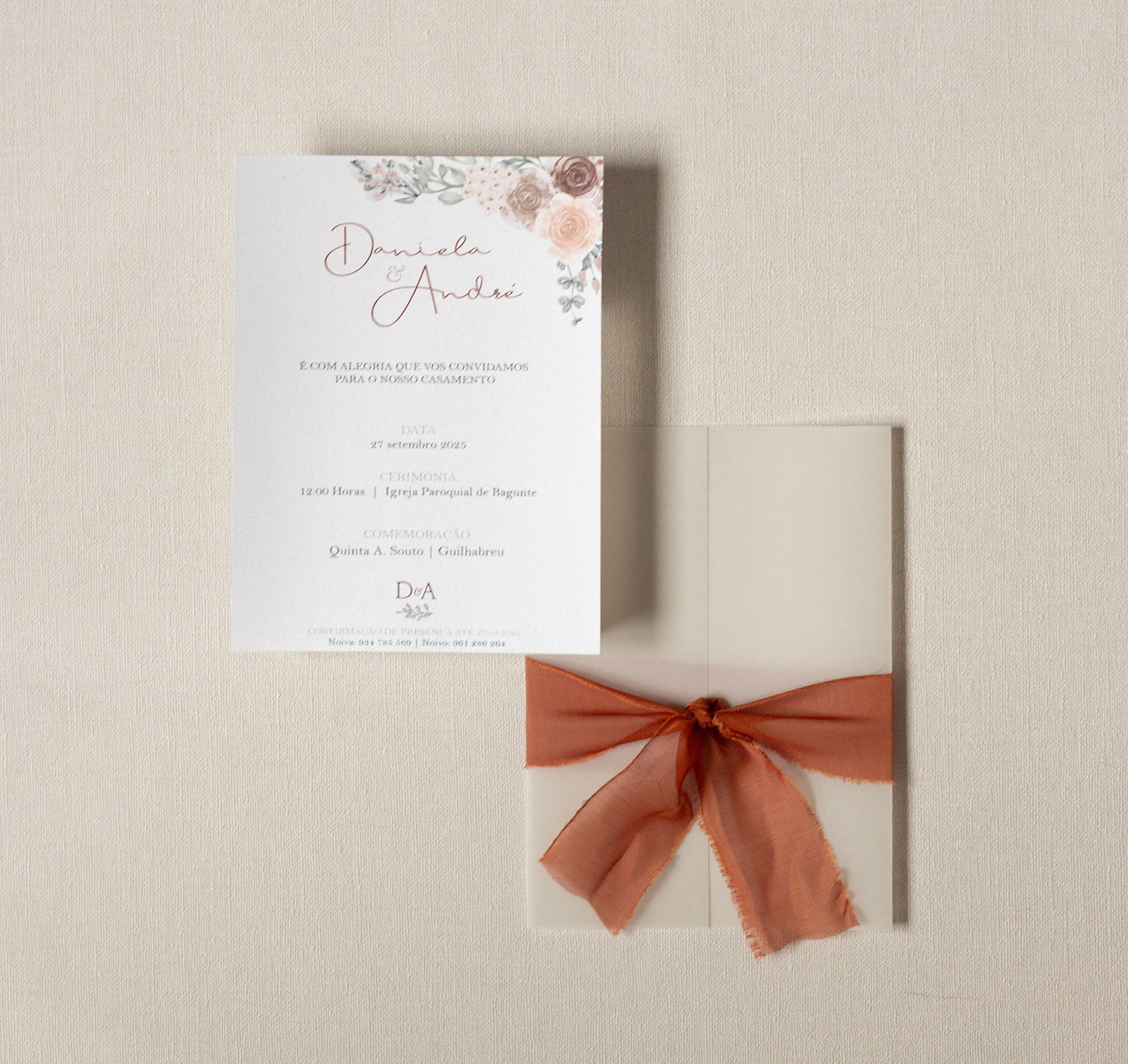 Este convite de casamento terracota é a combinação perfeita entre o rústico e o sofisticado. O envelope translúcido, envolvido por uma fita de corte manual em tom quente, cria uma harmonia natural e elegante, ideal para casamentos de inspiração boho. Cada detalhe reflete cuidado e autenticidade, resultando num design intemporal e acolhedor. Produzido com materiais de qualidade e totalmente personalizável, este convite é a escolha ideal para casais que procuram um toque de estilo e natureza.