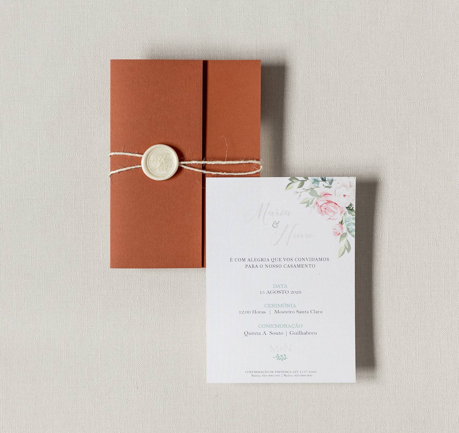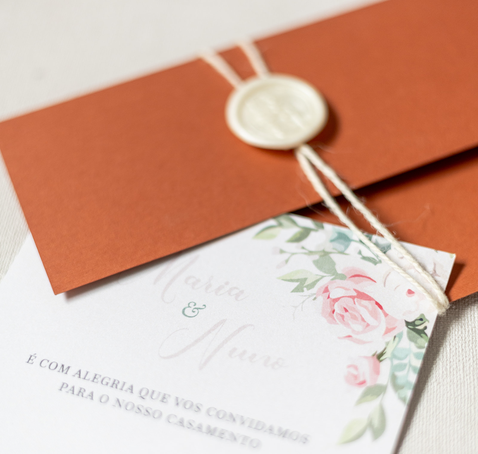 Convite de casamento terracota com lacre branco e design floral delicado. Um modelo elegante e minimalista para celebrações únicas.