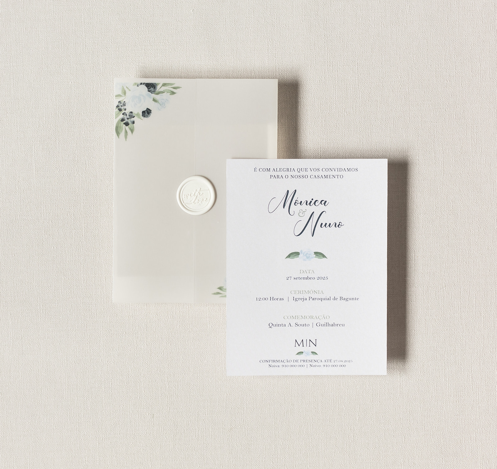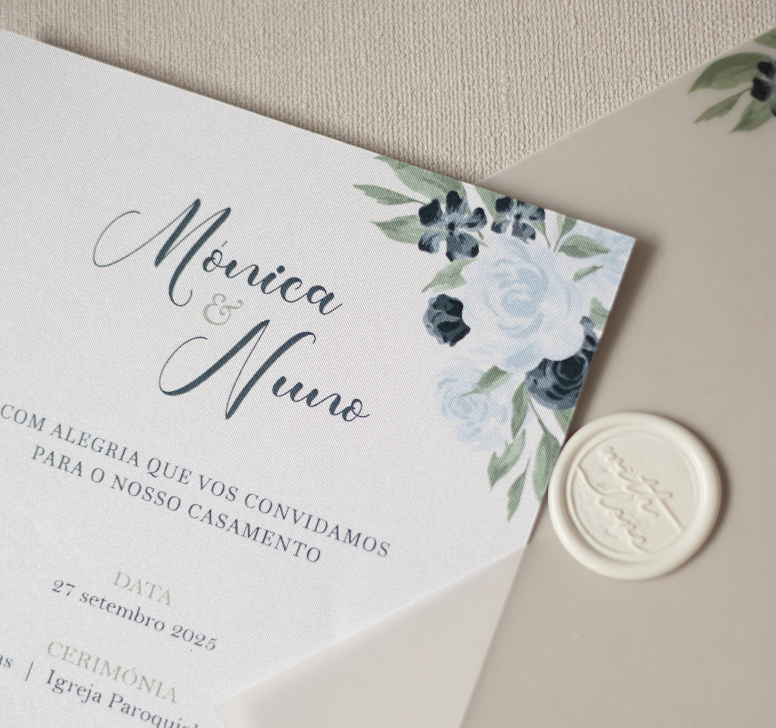Convite de casamento com envelope translúcido e flores em verde pastel. Um design romântico e elegante, perfeito para casamentos intemporais.