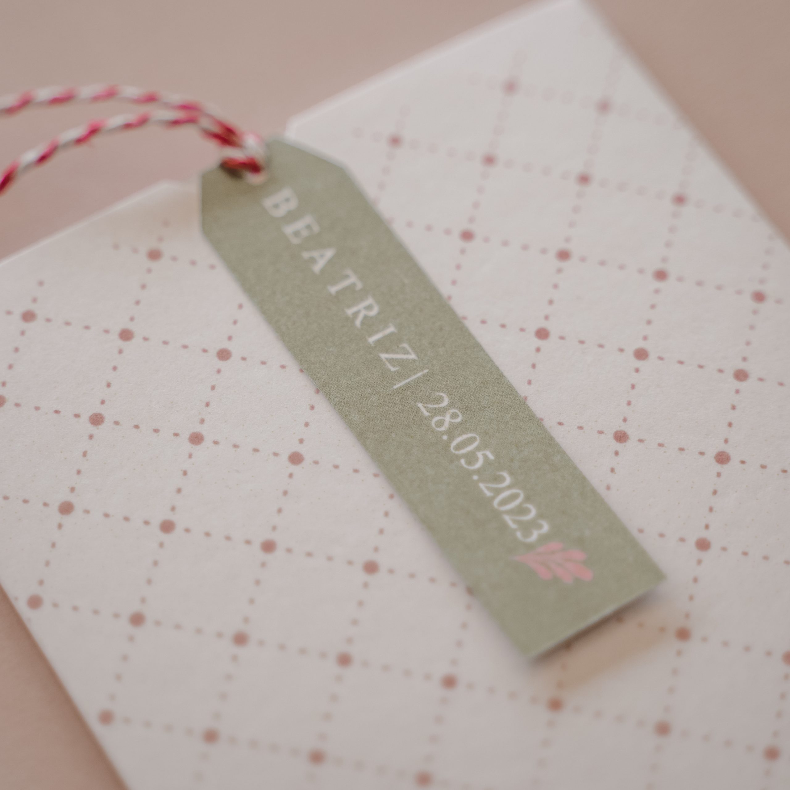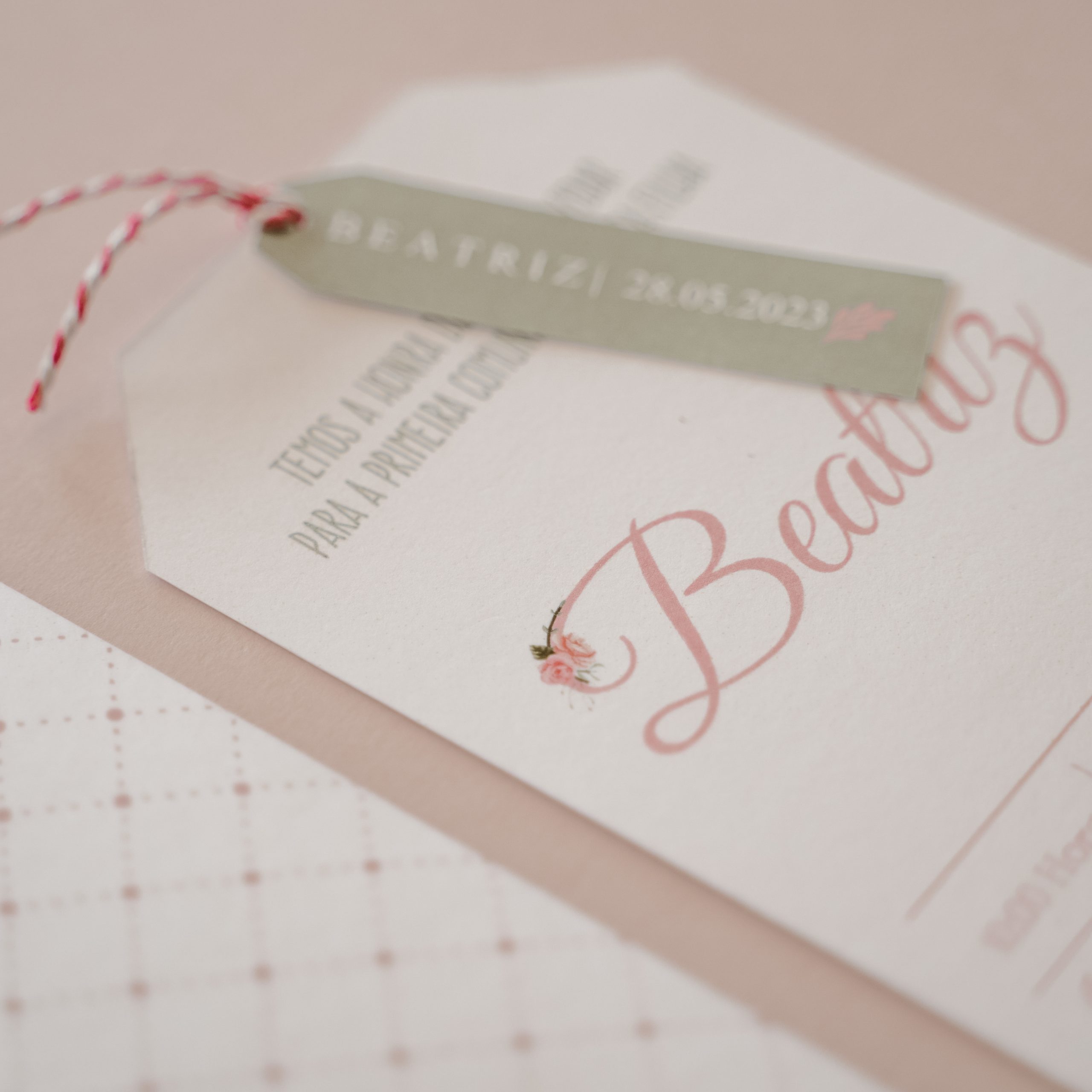 Decoração: com fio de duas cores e etiqueta (conforme imagem)