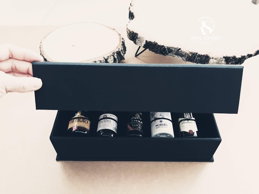 Interior com: 5 garrafas miniatura (Licor Beirão, Favaíto, Porto Cruz, Nordés, Ballantine’s) – em caso de rutura de stock em qualquer marca aqui apresentada, a garrafa será substituída por outra marca sem aviso prévio.