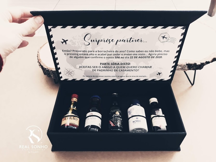 Convite em forma de caixa rija e fecho com íman para padrinho de casamento