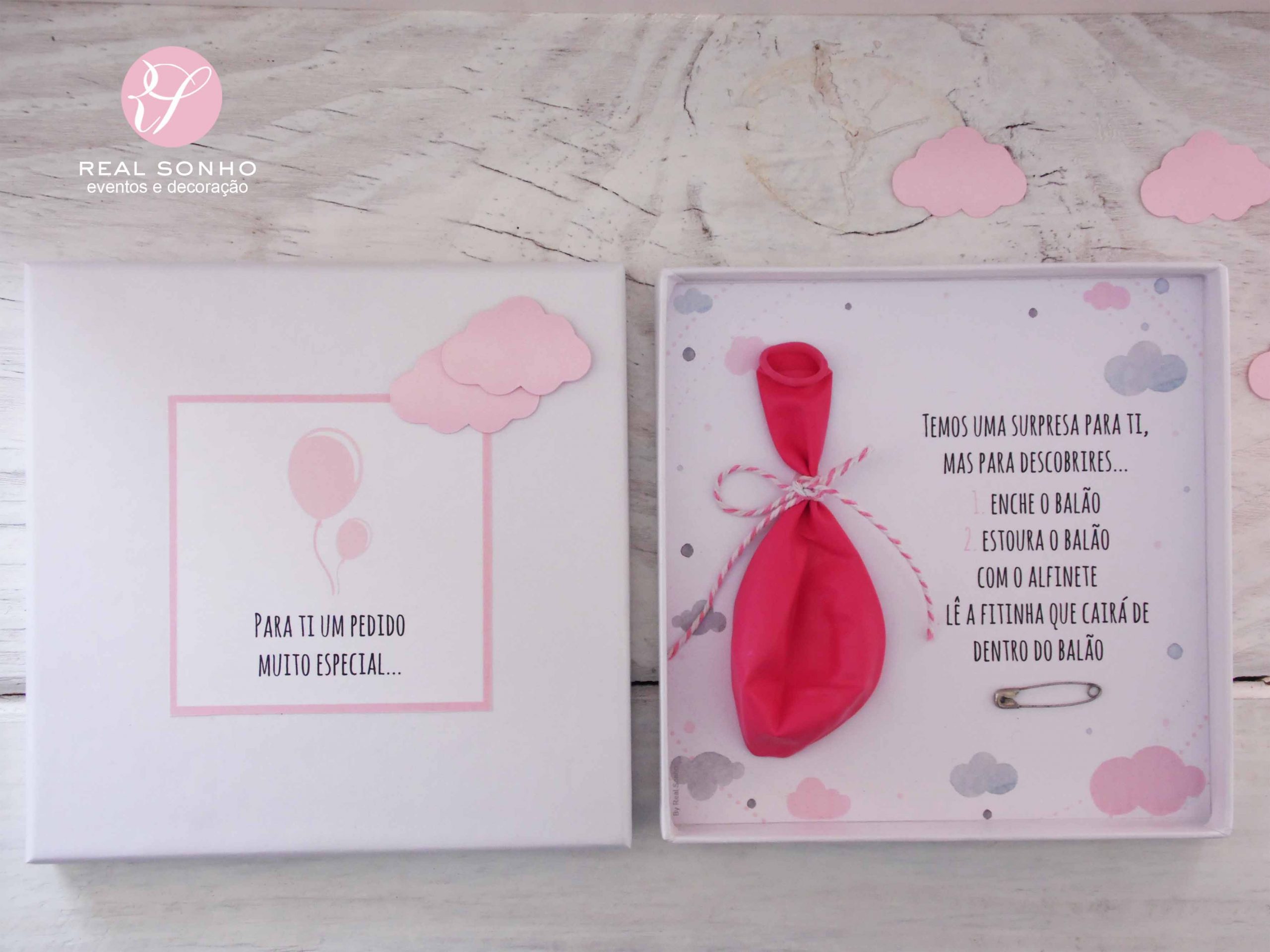 Interior: balão (com a mensagem dentro) e alfinete (para rebentar o balão)